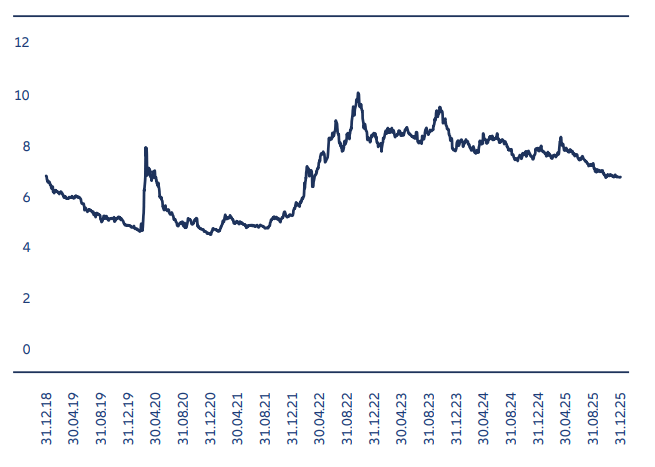 A range of technical factors also point to a positive picture for the asset class. Despite strong 2025 performance across EM hard currency and local currency products, capital allocation to EM remains low by historic standards. The improved EM narrative has led to inflows into the asset class, but these flows have not yet matched outflows that occurred in the previous few years. From 2022 to 2024, about USD 150 billion was withdrawn from emerging market debt mutual funds. In 2025, these funds attracted some USD 31 billion. We expect more inflows this year.