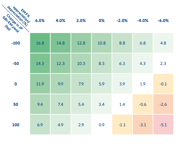 What about local currency bonds? Based on our expectation of a weaker dollar, we believe these could again outperform hard currency markets, as they did in 2025. These assets may also benefit from rate cuts in some emerging markets. The following grid shows a range of possibilities for the JP Morgan Government Bond Index-Emerging Markets (GBI-EM) Global Diversified index, which tracks local currency bonds. These scenarios are based on potential changes in foreign exchange and local rates (Exhibit 5). Again, we believe they indicate a promising outlook.