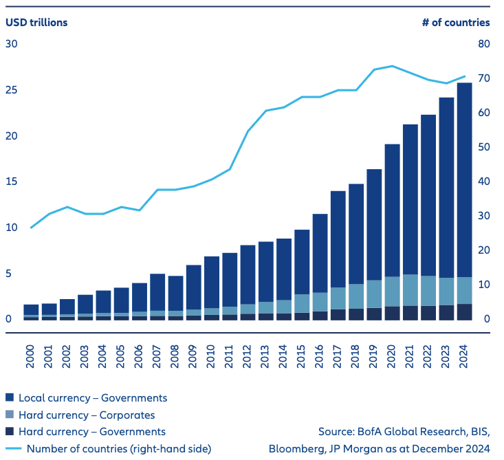 Emerging market debt has undergone a remarkable transformation over the last 30 years. Today, emerging market hard currency bond issuers span over 70 countries and include a wide array of opportunities across geographies and credit profiles (Exhibit 1).The landscape of emerging market local currency opportunities has also developed significantly, with the number of countries in the main reference index – the JPMorgan GBI-EM Global Diversified index – growing from 11 in the early 2000s to 19 today. Indeed, most emerging market issuance is now in local currency, reflecting growing and deepening domestic debt markets. With local dynamics taking on more importance, local currency opportunities have become a richer source of investment outperformance, or alpha. This evolution underscores what we see as the maturity and relevance of the asset class as a core component of global fixed income.