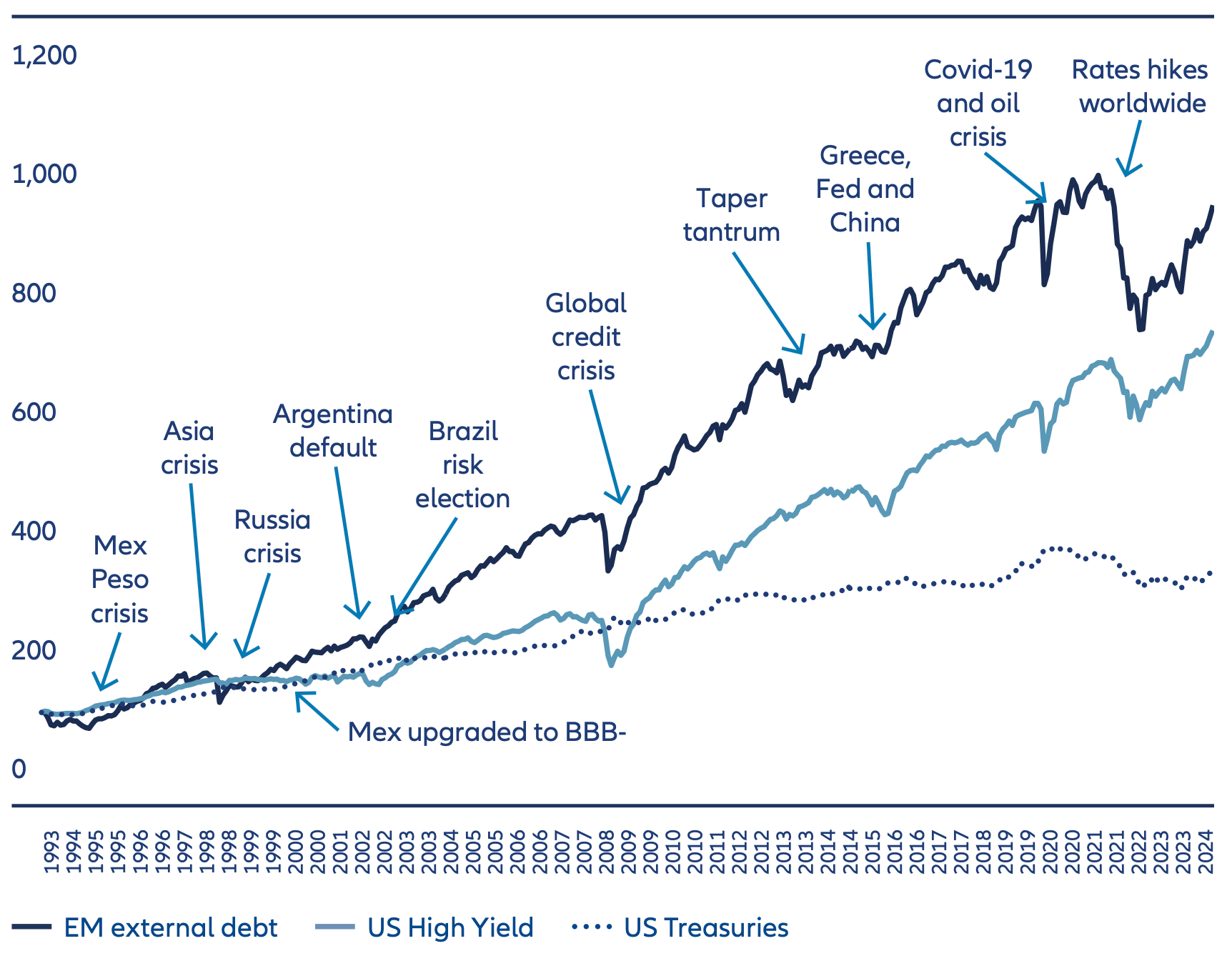Note: Total Return of J.P. Morgan EMBI Global Diversified Composite Index (JPEIDIVR Index), ICE BofA US Cash Pay High Yield Index and ICE BofA US Treasury Index, for a $100 Original Investment since 1993. EM External Debt: JPEIDIVR Index, US High Yield: J0A0 Index, US Treasuries: G0Q0 Index. Source: BofA Global Research, Bloomberg, J.P. Morgan EMBI Global Diversified Composite Index, ICE Data indices, LLC. Data as of 31 December 2024. Past performance does not predict future returns.