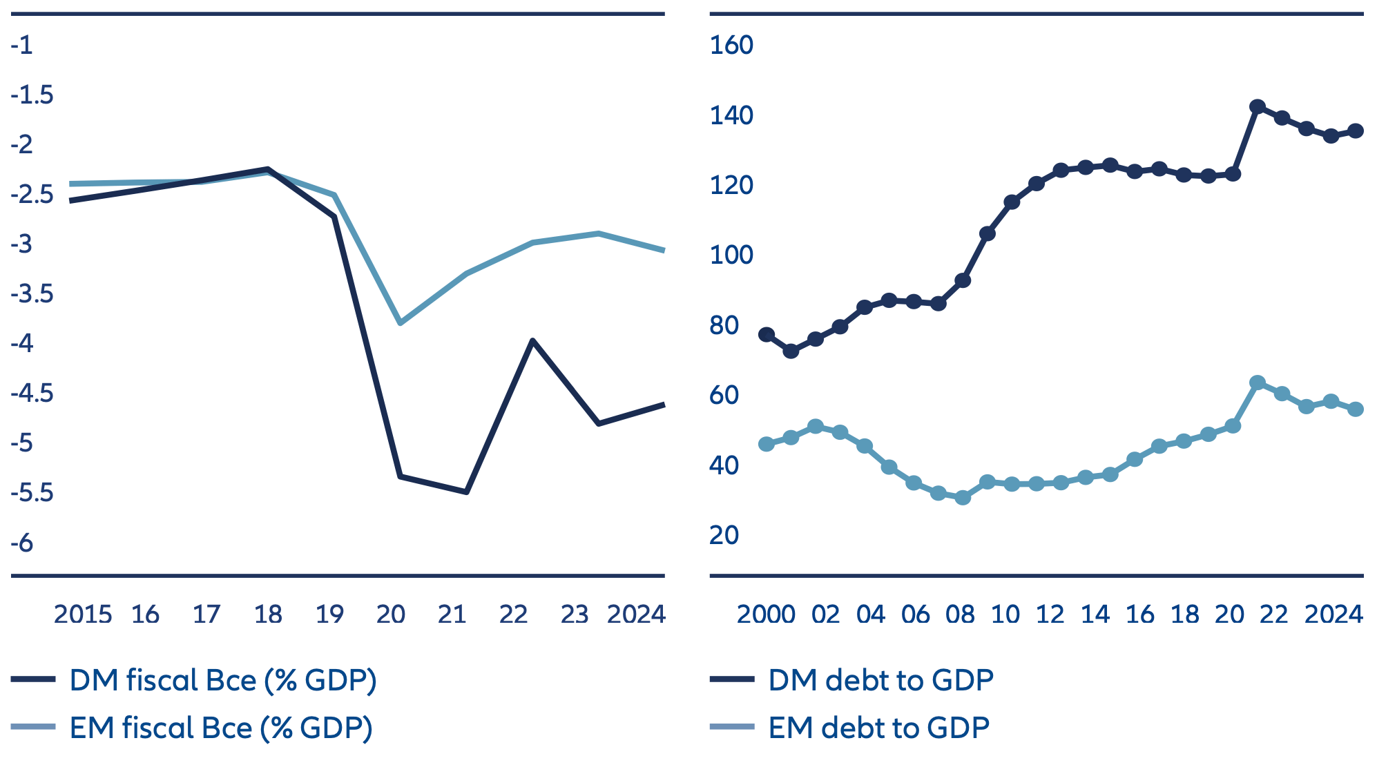 Source: Allianz Global Investors, IMF World Economic Outlook (WEO), as of January 2025. Note for right-hand side chart: emerging market (EM) and developed market (DM) debt as % of GDP. Based on WEO data with JP Morgan EMBIG weights for the EM average and simple average for DMs of US, UK, Eurozone and Japan.