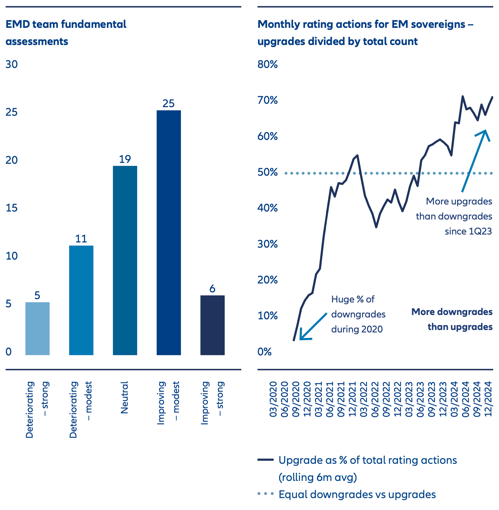 In our opinion, both our macroeconomic analysis and rating agencies’ credit assessments confirm an improvement in emerging market economic fundamentals. Since 2023, emerging markets are more likely to have had their credit ratings upgraded than downgraded (Exhibit 4). The asset class – as captured in the JP Morgan EMBIGD Index – is now, on average, rated investment grade, which provides another source of support.