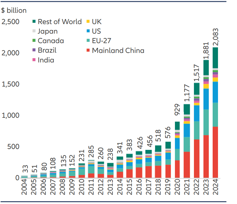 Let’s do a quick progress check on China’s energy transition. In 2024, China invested around USD 818 bn into green sectors such as renewables, energy storage, nuclear, EVs, and hydrogen. This accounted for almost 40% of total global investment, more than double any other country1. Six out of the top 10 EV battery makers are Chinese, with CATL and BYD taking more than half the market alone and far outpacing others2.