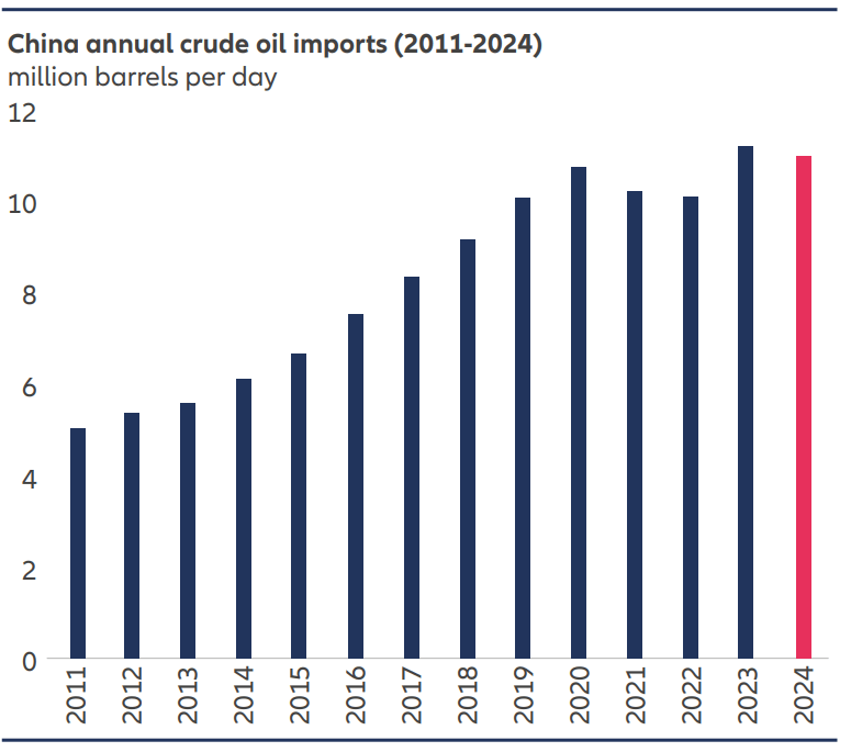 Admittedly, the renewables build-out has not always been purely driven by commerciality – wind and solar power have at times been wasted due to over-capacity and grid bottlenecks. However, the sheer scale has cultivated technological upgrades and cost leadership while enhancing China’s energy security, especially when the rest of the world is hungry for power in the AI era. In fact, in 2024, China’s crude oil imports saw the first year of decline in history, excluding the impact of Covid4. This is at least in part attributable to China’s move towards green electrification.
