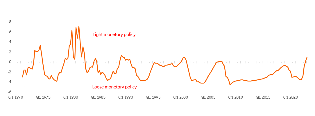 Exhibits 1 and 2 illustrate the link between financial conditions and financial crises over the past half century. The line in Exhibit 1 shows the difference between the real US Federal Reserve (Fed) funds target rate relative to our estimate of the so-called neutral rate – ie, the interest rate at which the economy is growing at the trend growth rate and inflation is stable.