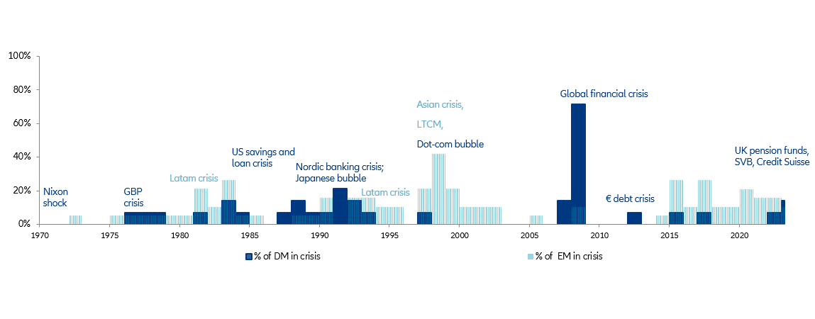 Source (for both exhibits): AllianzGI, BIS, Refinitiv, crisis definition following Leaven/ Valencia, Schularick/Taylor, Nyuyen/Castro/ Wood, own estimates, Financial Cycle estimate as at Q1 2023, financial crisis as at March 2023