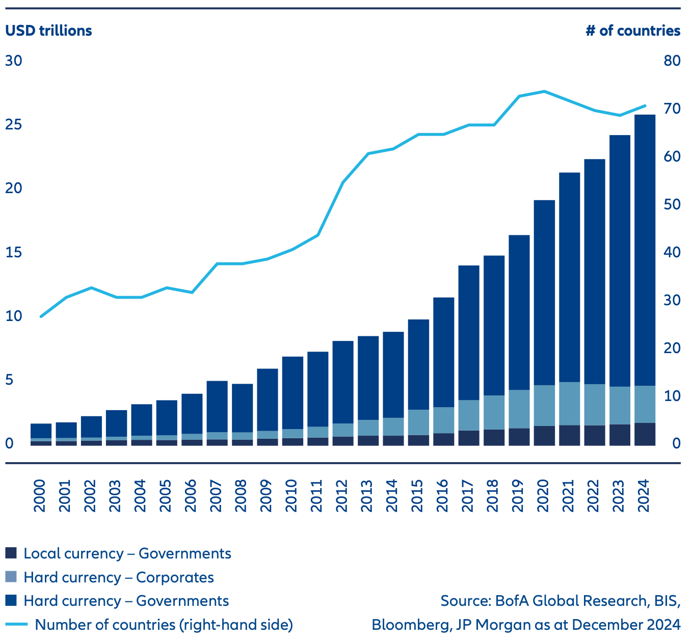 Emerging market debt has undergone a remarkable transformation over the last 30 years. Today, emerging market hard currency bond issuers span over 70 countries and include a wide array of opportunities across geographies and credit profiles (Exhibit 1).The landscape of emerging market local currency opportunities has also developed significantly, with the number of countries in the main reference index – the JPMorgan GBI-EM Global Diversified index – growing from 11 in the early 2000s to 19 today. Indeed, most emerging market issuance is now in local currency, reflecting growing and deepening domestic debt markets. With local dynamics taking on more importance, local currency opportunities have become a richer source of investment outperformance, or alpha. This evolution underscores what we see as the maturity and relevance of the asset class as a core component of global fixed income.