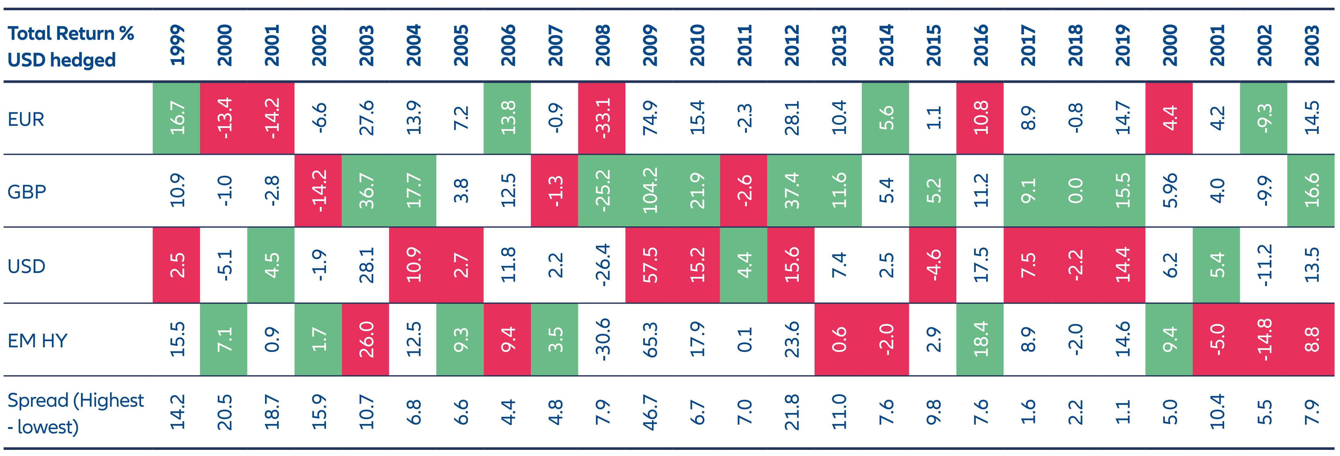 No individual high yield market has consistently posted better returns than the others over time (see Exhibit 4). A global high yield manager can continuously adapt their portfolio’s regional allocation based on changes in the prevailing backdrop to maximise its return potential. This is very different from adopting a static allocation to regional buckets.