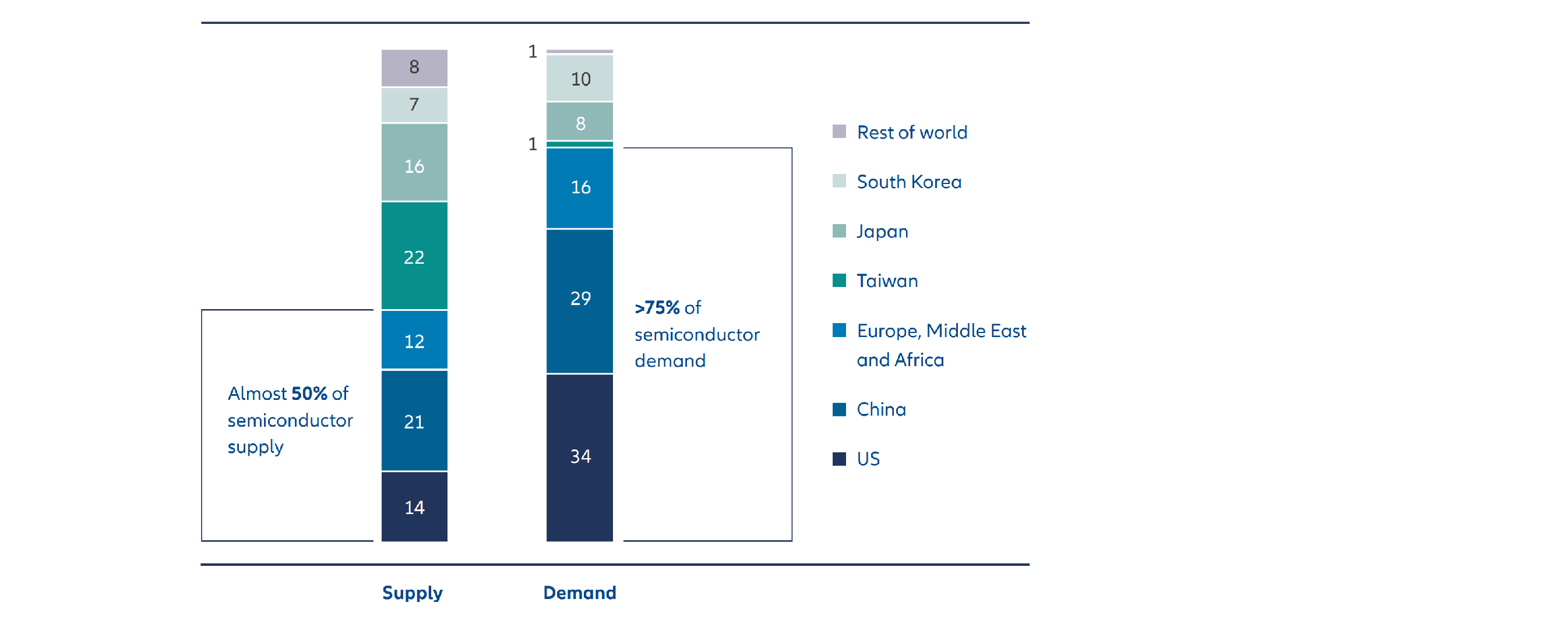 Exhibit 2: Semiconductor supply and demand by region in 2021 (% share)