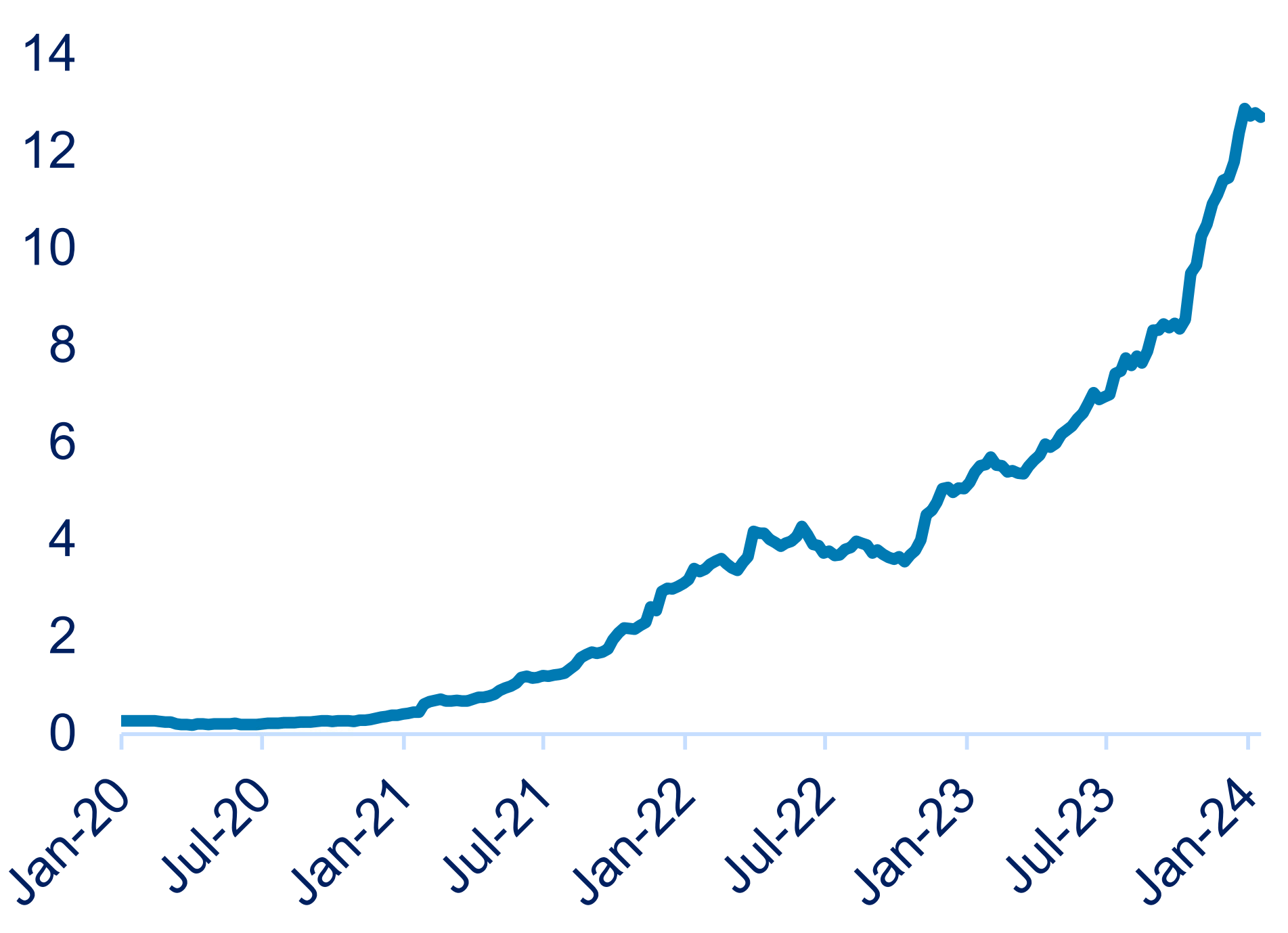 Investors are recognizing the attractive prospects of Asia’s new economic powerhouses. Assets under Management in Emerging Markets or Asia ex China strategies have reached over USD 12.5 bn (in January 2024). As economic paths diverged between China and its Asian neighbours, so did their stock markets. Indices excluding China have fared better over the past three years, highlighting the decoupling of China and other Asian economies.